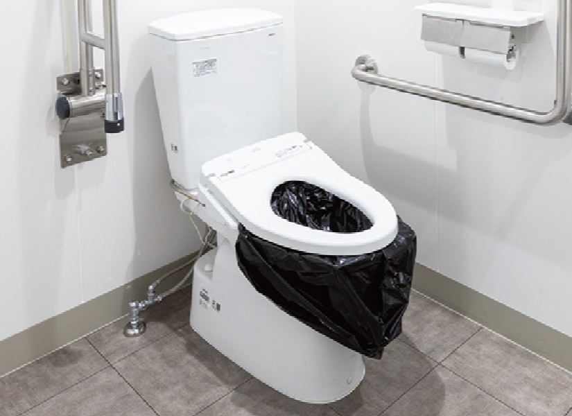 トイレや簡易便座に排便処理ポリ袋を被せます。トイレの場合は封水で濡れないように、先に別のポリ袋を被せておくのも有効です。