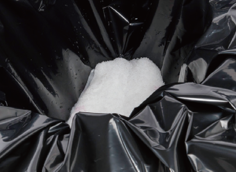 小便の場合は排便処理ポリ袋の中に消臭固化剤を入れてから排泄します。外袋が水分で溶け、中に入っている消臭固化材が水分を吸収します。